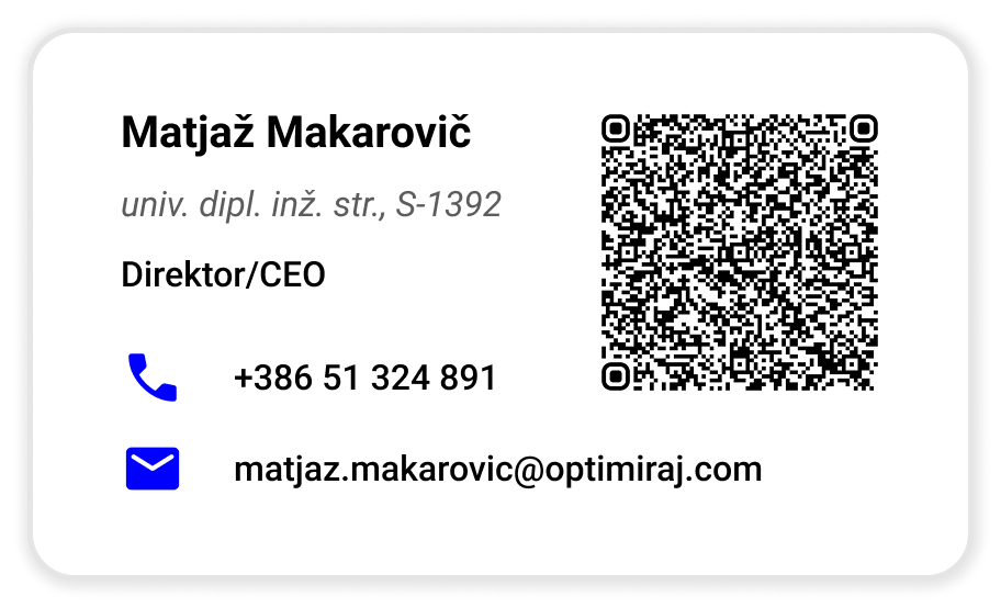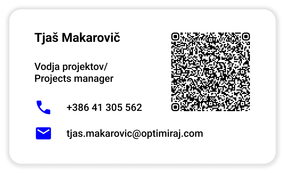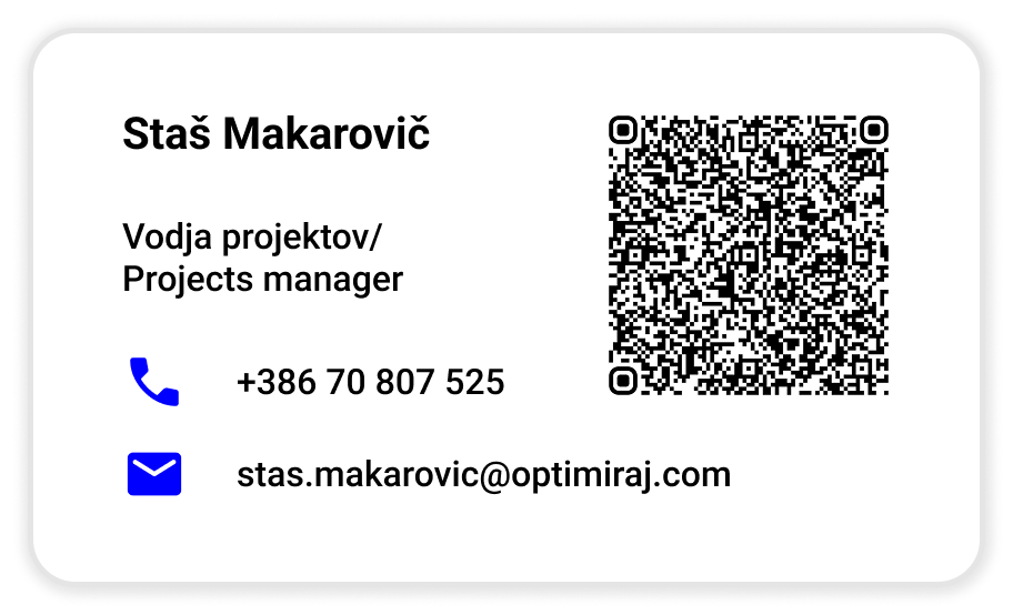 Kontaktirajte nas Osebna izkaznica podjetja: E-mailSpletni naslovMatična številkaID številka za DDVTransakcijski računi info@optimiraj.comwww.optimiraj.com9259724000SI 32880570SI56 0400 0027 7203 728